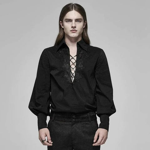 Lace-up shirts are commonly associated with Gothic fashion. The crisscross lacing on the front of the shirt adds a visually appealing and intricate element that aligns well with the Gothic aesthetic. It creates a sense of mystery and elegance, often associated with vampires.