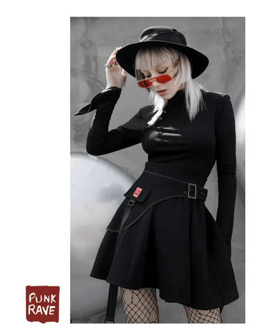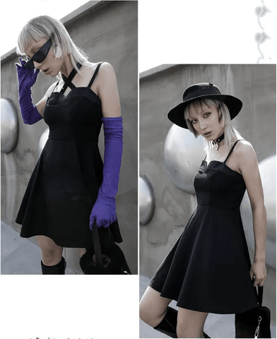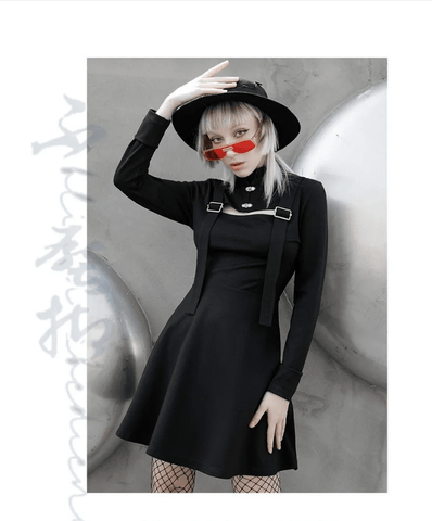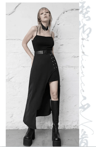 Delivering a cool and sexy vibe at the same time, this dress present a new way into the punk and Goth style. The asymmetry of the dress is what makes it noticeable from the first look, especially referring to the double row of metal ring side buckle of the skirt. The slit is high and open to the side. It comes with a unique cloud plate buckle choker. The top is tight and simple, with thin straps.