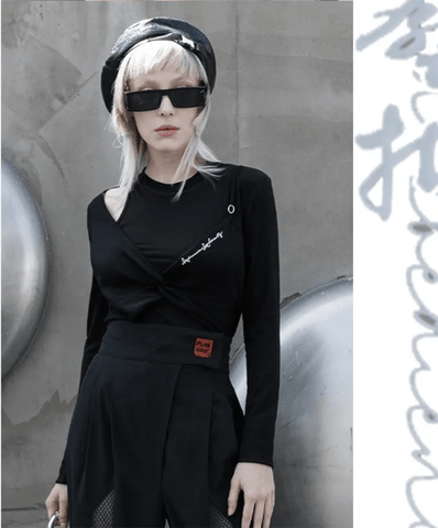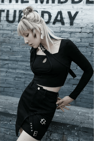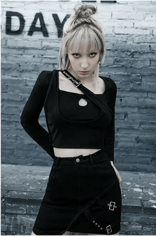 If the asymmetry is just boring for you, the addition of straps and belts will certainly make It look more fun. The new cool skirt is different. It is a sexy hip skirt with metal button mix with decoration, delivering full punk feels.