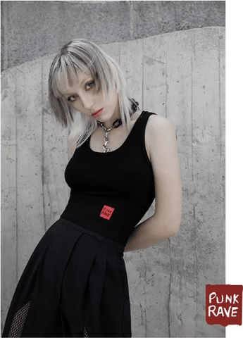 The design of water-drop opening comes as a center piece of this top. It provides interesting and sexy appeal. There is also a long ribbon embroidered with the letters of Punk Rave(Brand Name).Going all the way to the back, the straps create straight or cross turns, each with their own personality, so it's up to you to style it yourself.
