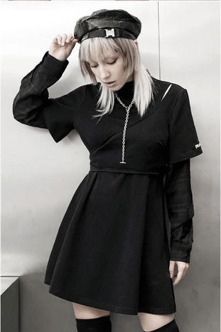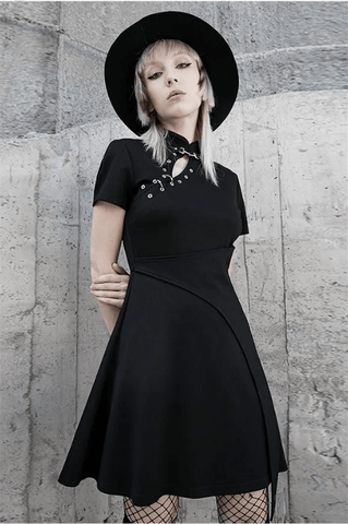 Similar to the previous dress, but putting the accent on the side collar is this dress. The style of the dress also features A-line skirt, with side opening that has tiny holes and represent a look of a belt. This is truly a punk dress that is great for wearing through the entire year.