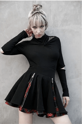 Women's Grunge Black Skirts Splicing Zips Plaid Skirts
