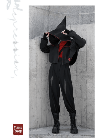 Although it might seem as simple wind jacket, this is quite interesting wind jacket. It is both modern and delivers punk style. The cropped and short length with the pointy wizard hood deliver a fabulous and extraordinary piece. The fabric is windproof, which will keep you warm. The Chinese style Logo print is present on the side.