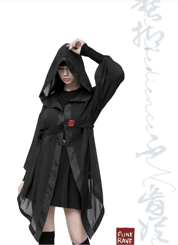 A gothic look cannot be imagined without owning and wearing a cloak. This one is loose in the cut, with medium to long length. The detached hoodie comes in the form of a pointy wizard hat. Made out of a thin chiffon material, it is a comfortable piece that will keep you protected from the sun. The belt features bright Chinese style seal embroidered cross with a thumb buckle.