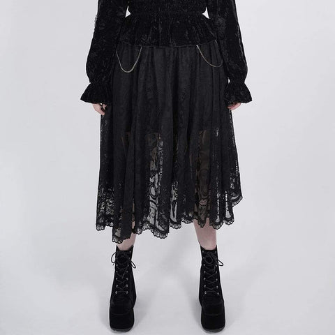 This plus-size midi-length skirt most closely resembles the look and the style of the modern midi pleated skirt. The A-line cit starts with an interesting collar, upon which hang some interlocking thin chains. They fall over the rich lace that is wide and beautiful. The underpart of the skirt is short and full.