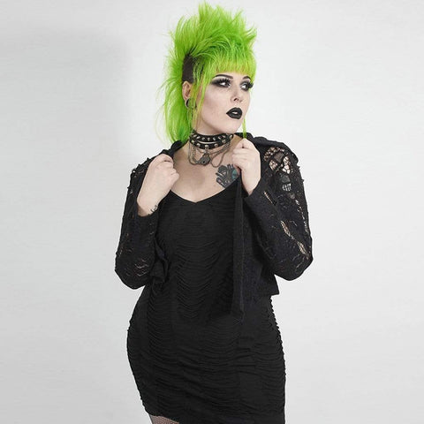 Women's Gothic Grungy Black Lace Hooded Top With Flared Sleeves