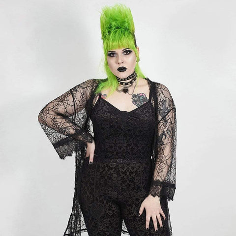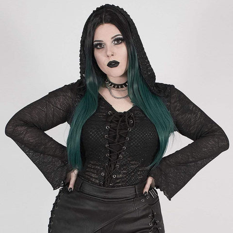On a first look, this top might deliver an appearance of snakeskin print. However, that comes from the lace fabric. The central lace-up details, as well as the hood and the wide sleeves, create the ultimate plus-size Gothic top.
