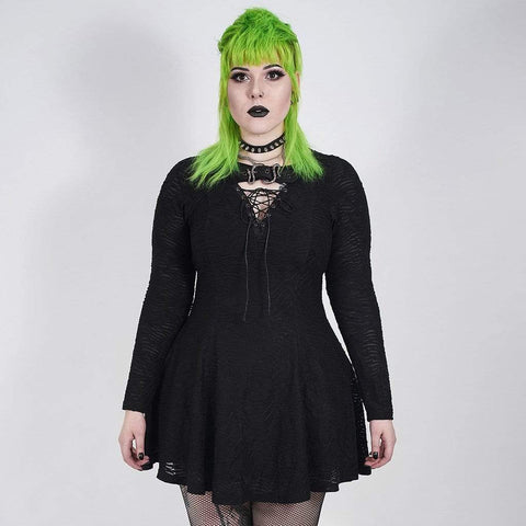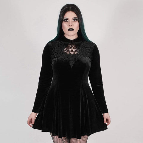 Hearts are pretty interesting detail in the fashion, and for that matter, in the Gothic fashion style too. The dress resembles the look of a modern-day bodysuit. Besides the heart print that is dominant and creates the dress, one other fabulous detail is the spiderweb opening that covers the front. Made of delicate nice, it adds a wonderful addition to this plus size short dress.