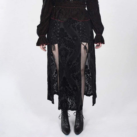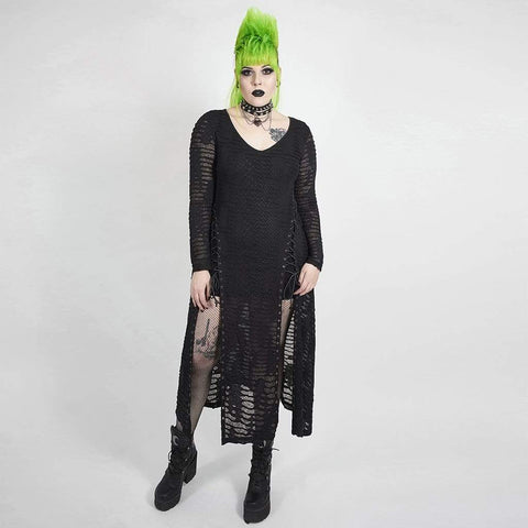 The full punk, rock, metal, and Gothic styles come together in this interesting dress. What is super cool is that the see-through fabric allows the skin to be visible. The underpart of the dress is fully black, covering the strategic places. The midi length is interrupted with high straight side slits. The beginning of the side slits is nicely blended with the top part, featuring double lacing.