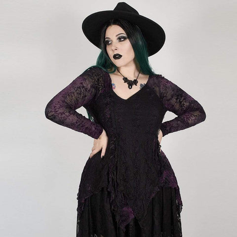 Asymmetry is one of the biggest ad most popular Gothic styles. This top, although it might look a bit witchy, carries different kinds of elements, where the asymmetry of the length is most dominant. The sleeves and tight and follow the line of the arms. The combination of violet and black is perfect for those who need to add a bit of different color.
