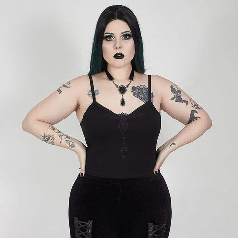 Being plus size does not mean that you cannot enjoy some of the best camisoles. The jacquard spaghetti-strap camisole is a modern and trendy piece, that will fit many styling options and outfits. The discreet floral finish that comes as basic print makes this piece very fashionable and delivers perfect Gothic style.