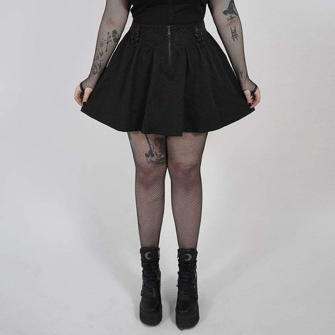 Women's Plus Size Gothic Black Flower Embroidered Front Zip Short Flared Skirt
