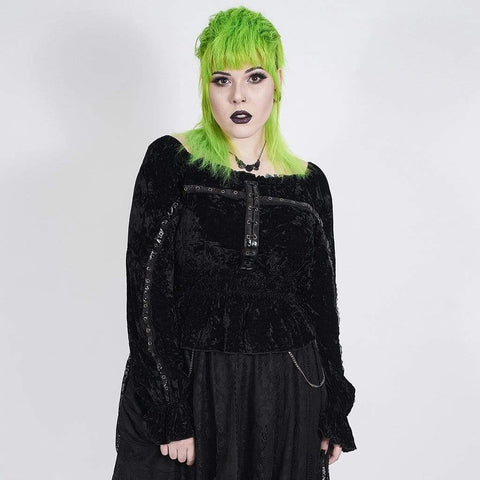 Having some fancy top that will elevate your Gothic outfit is simply a must. This is particularly the kind that flatters the plus-size body – it comes in black velvet, wide opening, subtle ruffles, and long sleeves. There is one punk detail that goes all the way from one sleeve to the other.