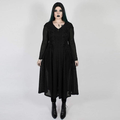 Long coats are one of the most identifiable fashion garments that truly depict the Gothic style. This one is particularly interesting because of its sheer fabric that is very modern, and the dark maroon shade – true Victorian shade. The coat features a hood, a back waist lacing, and side lacing details that keep the Goth style on point.