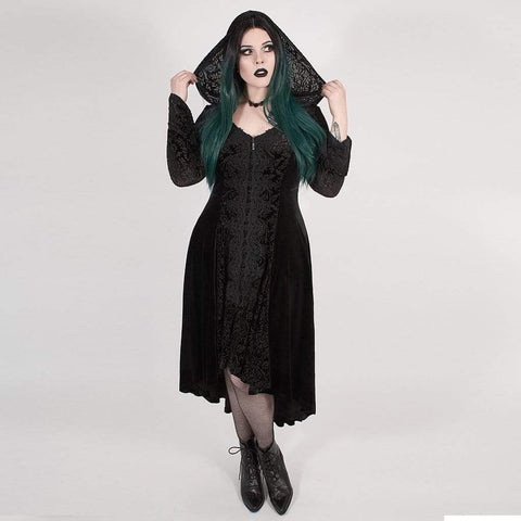 Looking fashionable and stylish in the goth style can easily be achieved with this long coat. Keeping the classic black as a starting point, this long coat can also serve the purpose of a dress. The velvet and the lace details make it look stylish for all plus-size girls.