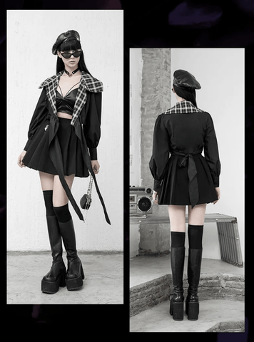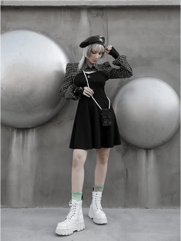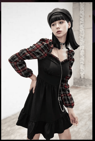 When the black plaid meets the flower bud sleeve, it results is a look of retro and feminine style, full of sweetness and cuteness! The decorations of metal chain of pendant of white and butterfly add more punk feeling.