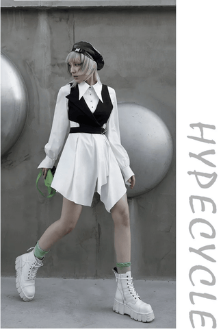 Suspenders and skirts look very cool and stylish especially if they come with contrasting straps like this one. With the high waist and the interesting slit, they provide super cool look.