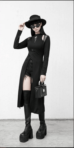 Coming between a dress and a cape, this is the garment that will present you in a full original rock and punk style. The cutout shoulders are filled with mesh to the ends for a bigger sexy look. The line follows the body, opening up on the front and delivering some futuristic style.