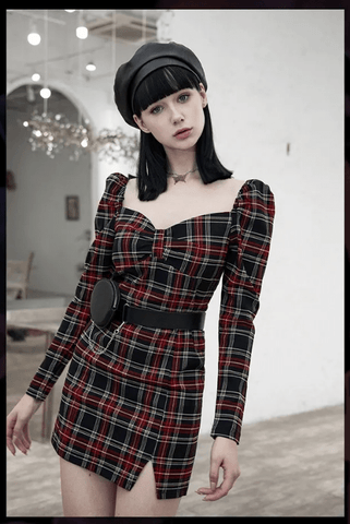 The checkered print of the red and black contrast of the plaids comes together into a dress that captivates with its colorfulness. The bubble sleeve have an addition of lace which makes it look more girly.