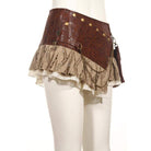 Description:This wrap around skirt can be worn as an over skirt or on its own. Made with leather, cloth and delicate lace the multilayered short skirt is designed like a wraparound with an asymmetric hem. Studs, chains, gears add the elements of steampunk while a large waist pouch that can be suspended from the skirt comes in handy for a party night.
