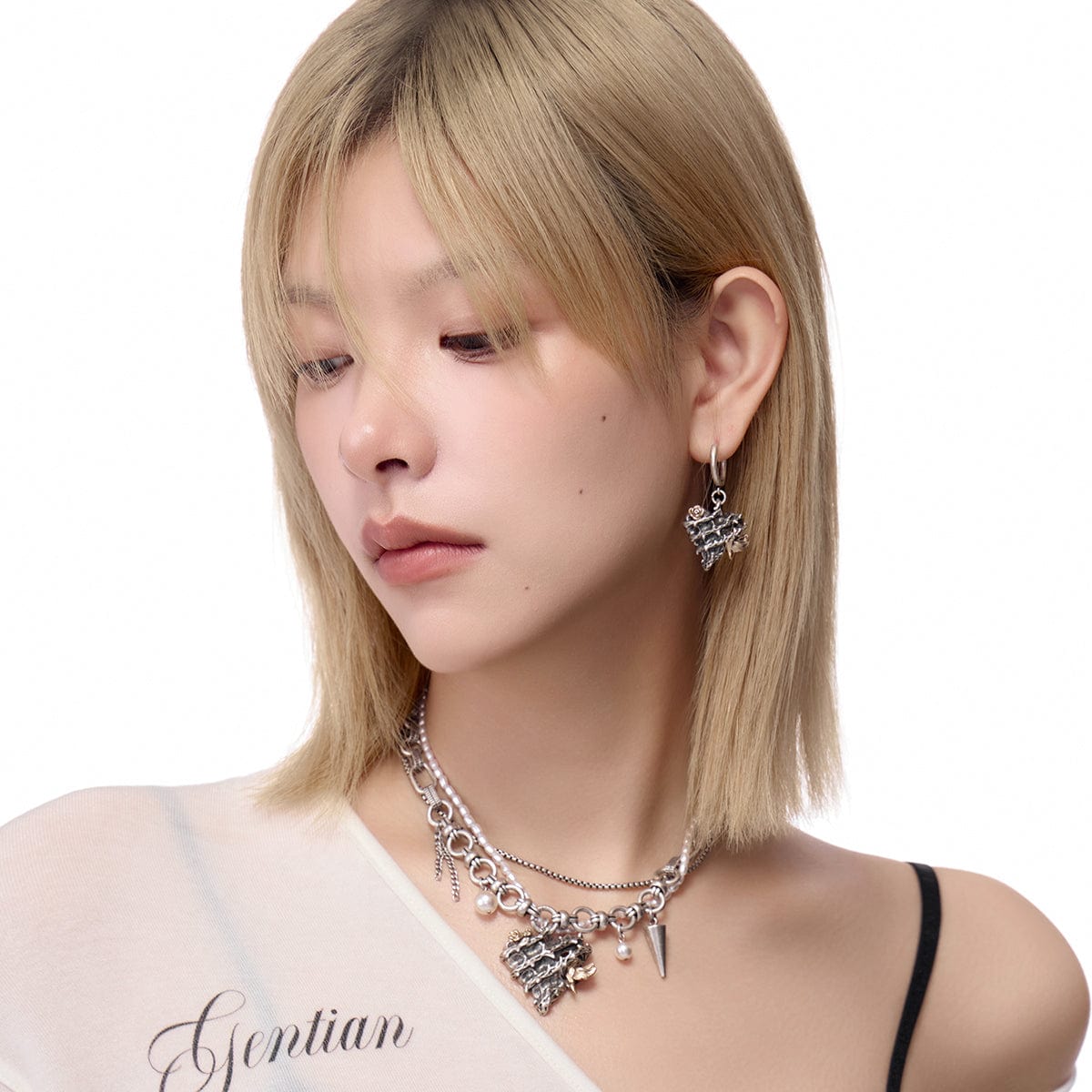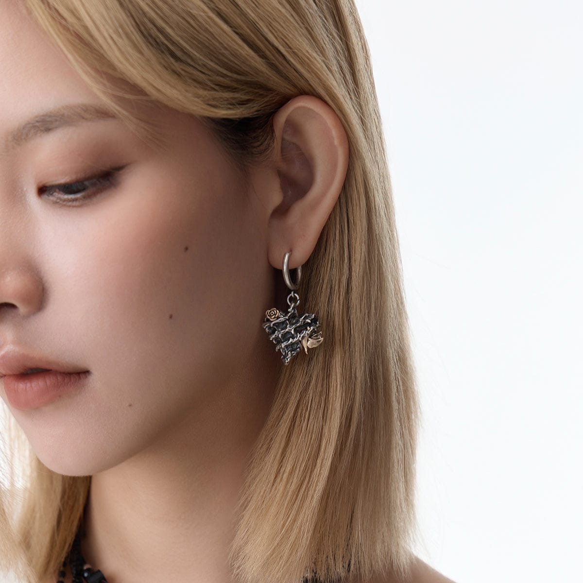 The centerpiece of each earring features a heart engraving design, symbolizing love and passion. However, these hearts are entangled with thorns, adding a dark and rebellious twist to the classic heart motif. The intertwining of the hearts and thorns creates a captivating contrast that exudes edgy charm.