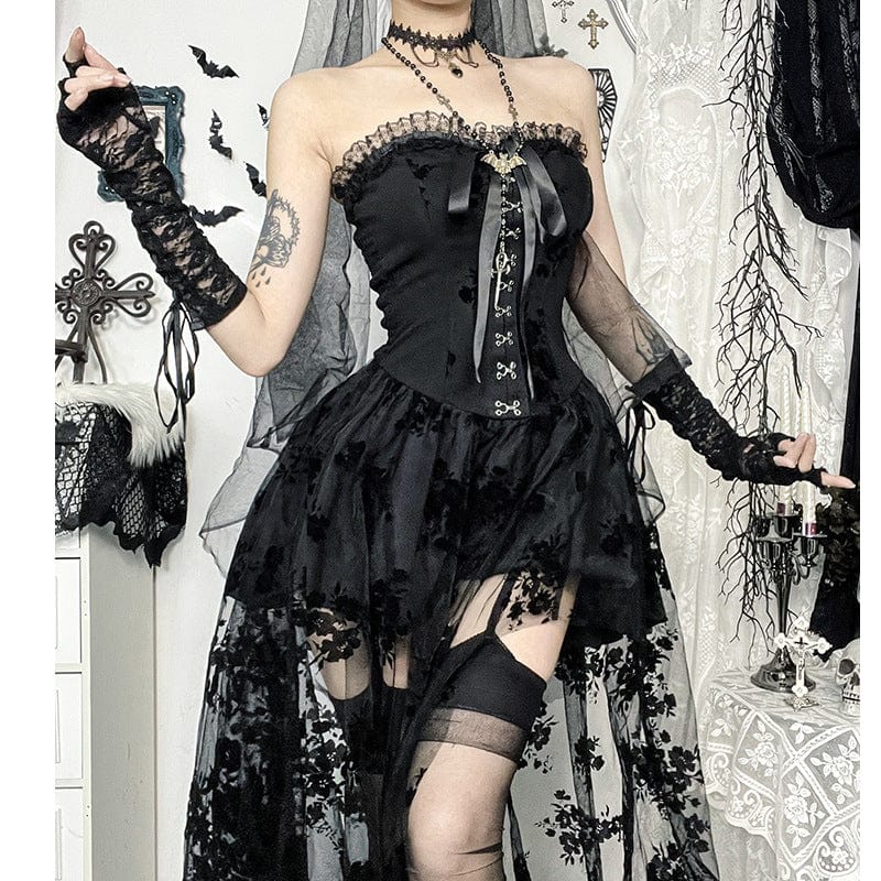 Women's Gothic Off-the-shoulder Floral Mesh Splice Party Dress
