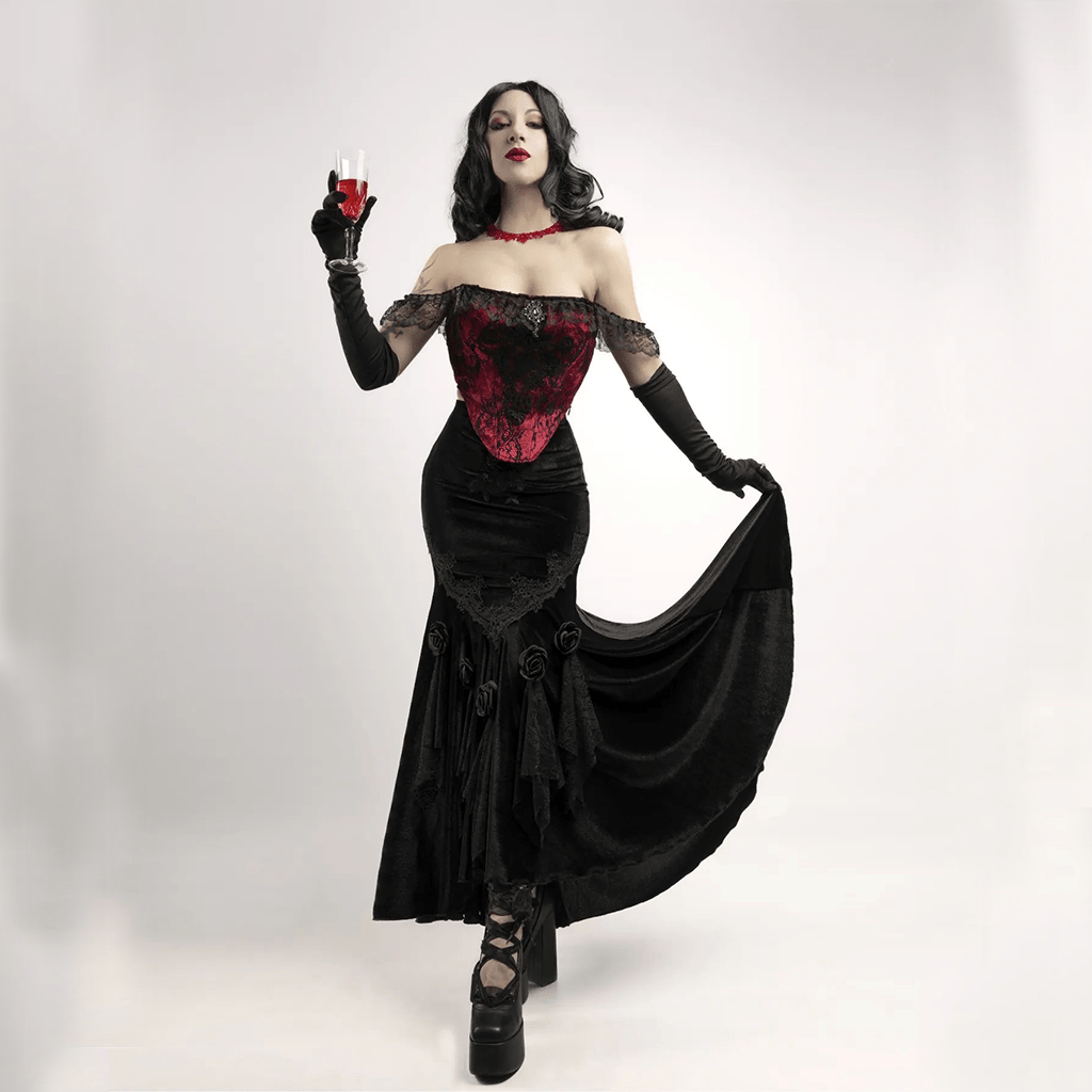 Women's Gothic Black Rose Embroidered Fishtail Maxi Skirt