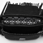 The bag is adorned with striking 3D skull rivets and tassels of varying lengths, creating movement and texture while amplifying its punk rock edge. A metal zipper pocket at the back provides added storage and security, while the skull pendant perfectly complements the bag’s rebellious, dark vibe.