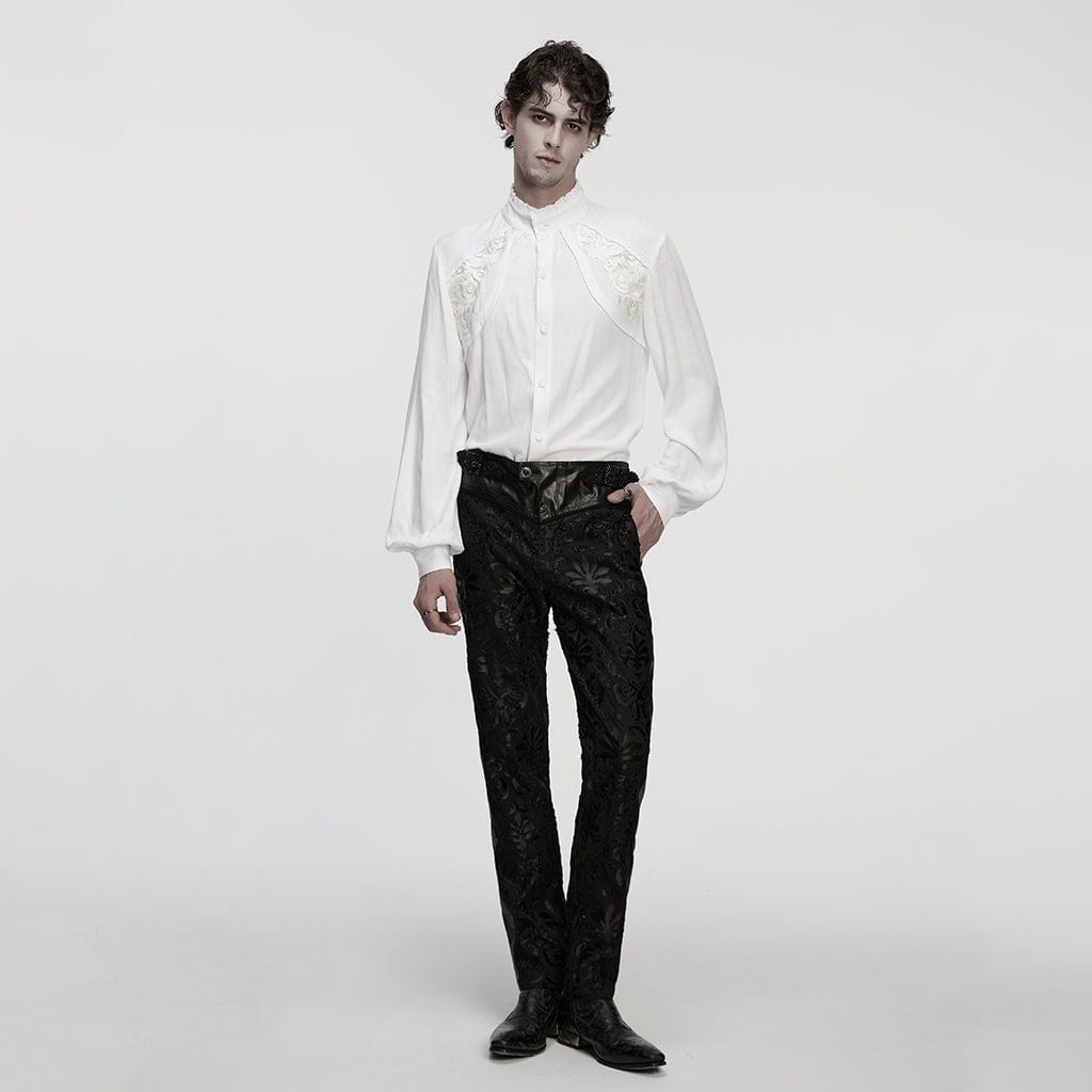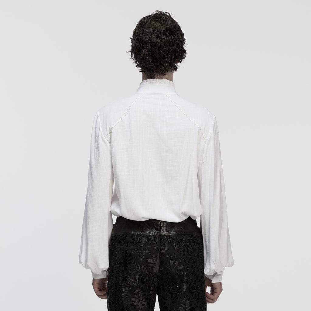 Men's Gothic Floral Decal Stand Collar Lantern Sleeved Shirt White