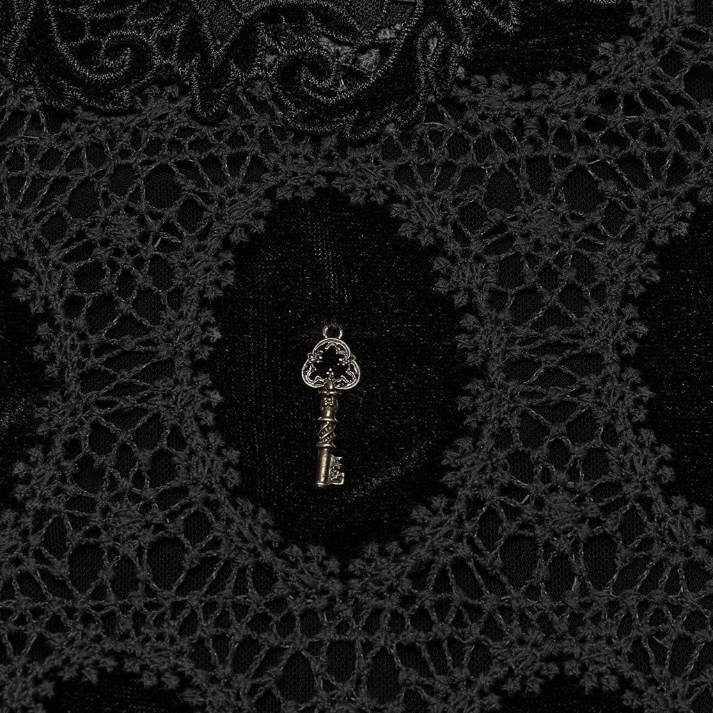 The puff sleeves add a dramatic flair to the design, enhancing the shirt’s vintage-inspired gothic victorian charm. The intricately embroidered lace around the collar and sleeves further elevates the overall aesthetic, while the subtle key charm at the neckline brings a touch of mystery and allure to the piece. The detailed floral lace trim along the hemline adds a perfect finishing touch to this exquisite design.