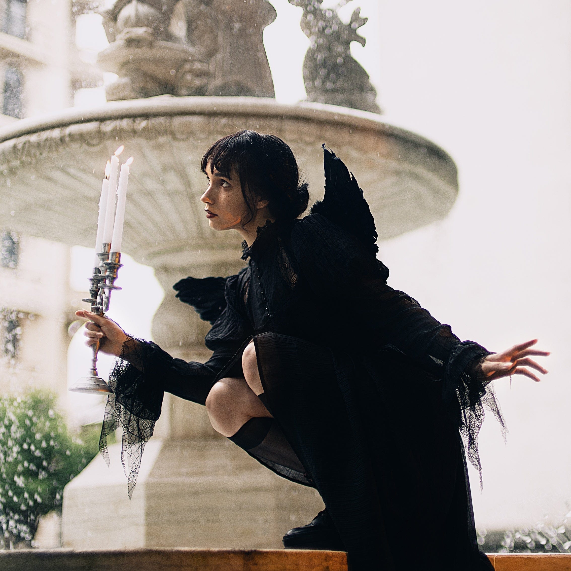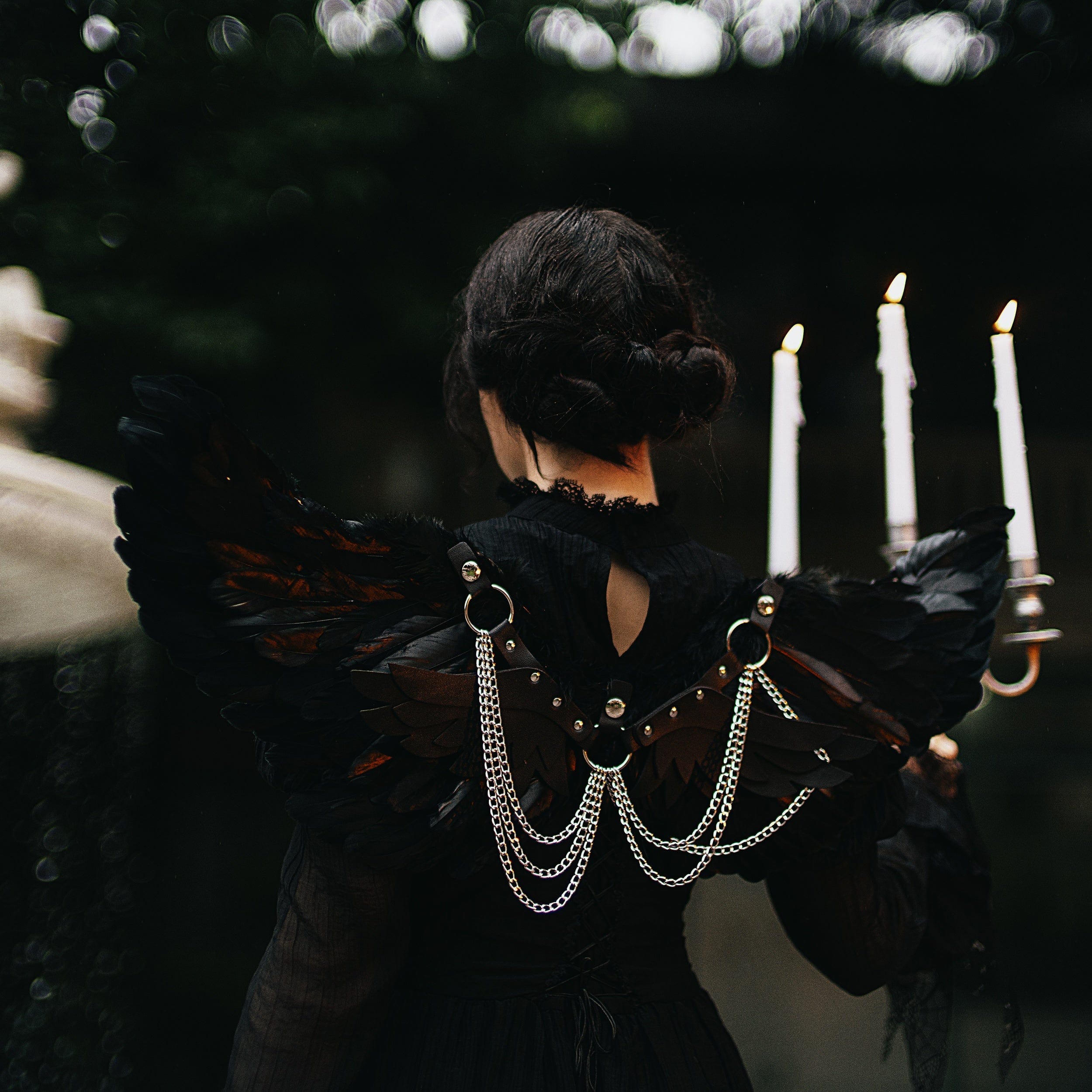 This harness is made of faux feather and leather. Vivid demon feather wings are on the back. It has stacked and detachable multi-level leather wings and chains.
