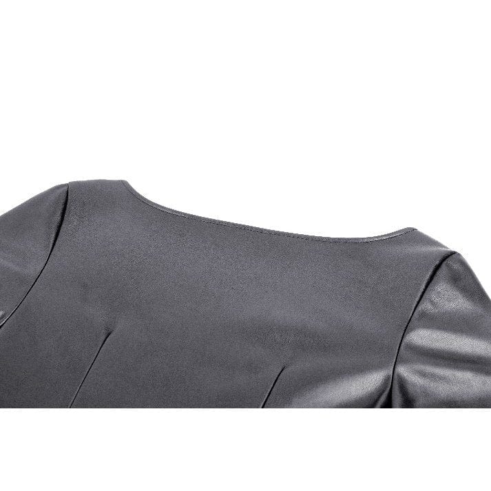 This dress is the ultimate fusion of Gothic and punk style, featuring a bold, edgy design crafted from sleek black leather. The eyelet straps interlace with snakeskin wax rope, forming a powerful lace-up structure. The asymmetrical waist design adds to its unique aesthetic, with one side adorned with a leather eyelet pocket and the other featuring a sword-like detail. The vertical, uneven arrangement creates an added layer of dimension and intensity, making this piece perfect for those seeking a statement-making, rebellious look.