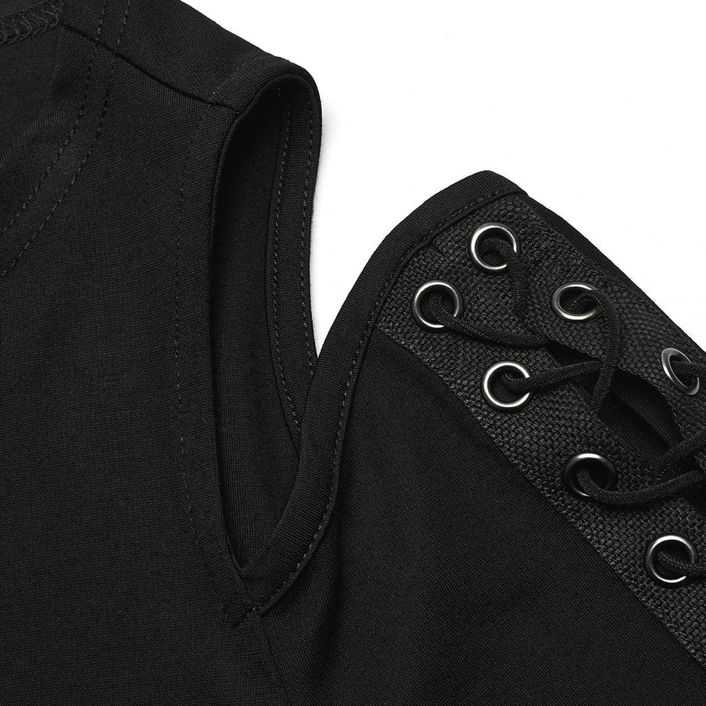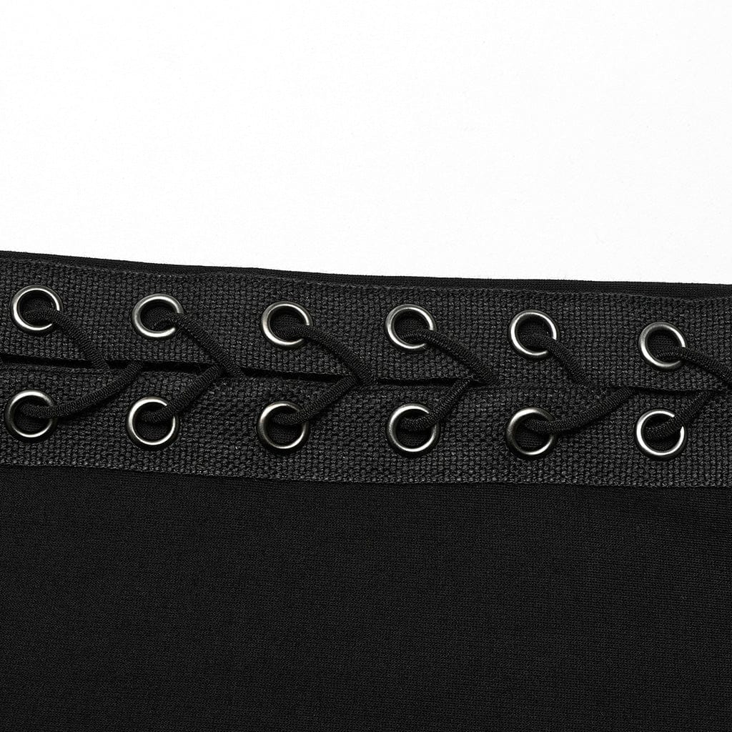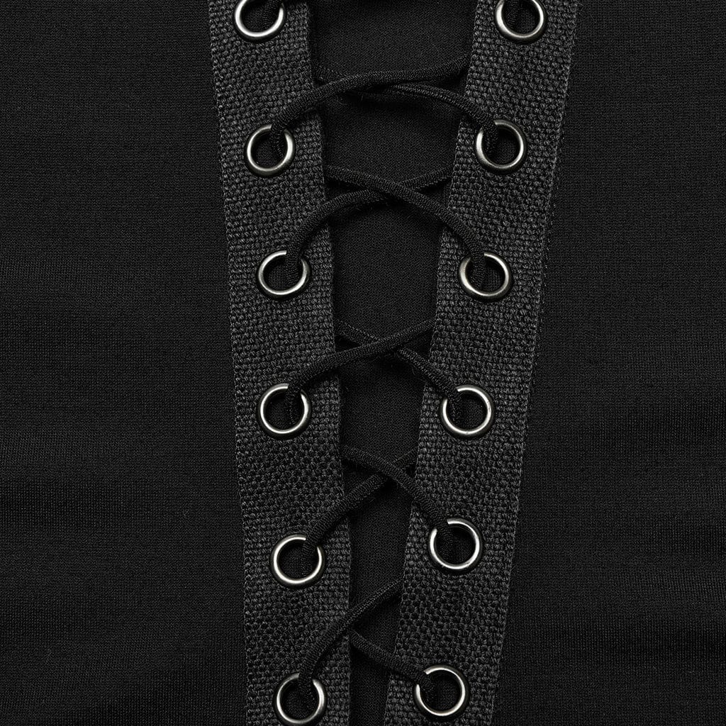 This punk crop top is off-shoulder and V-neck design. Lace-up on the neck and sleeves. Flared and pointed cuff. Slim fitted silhouette and good elastic fabric.
