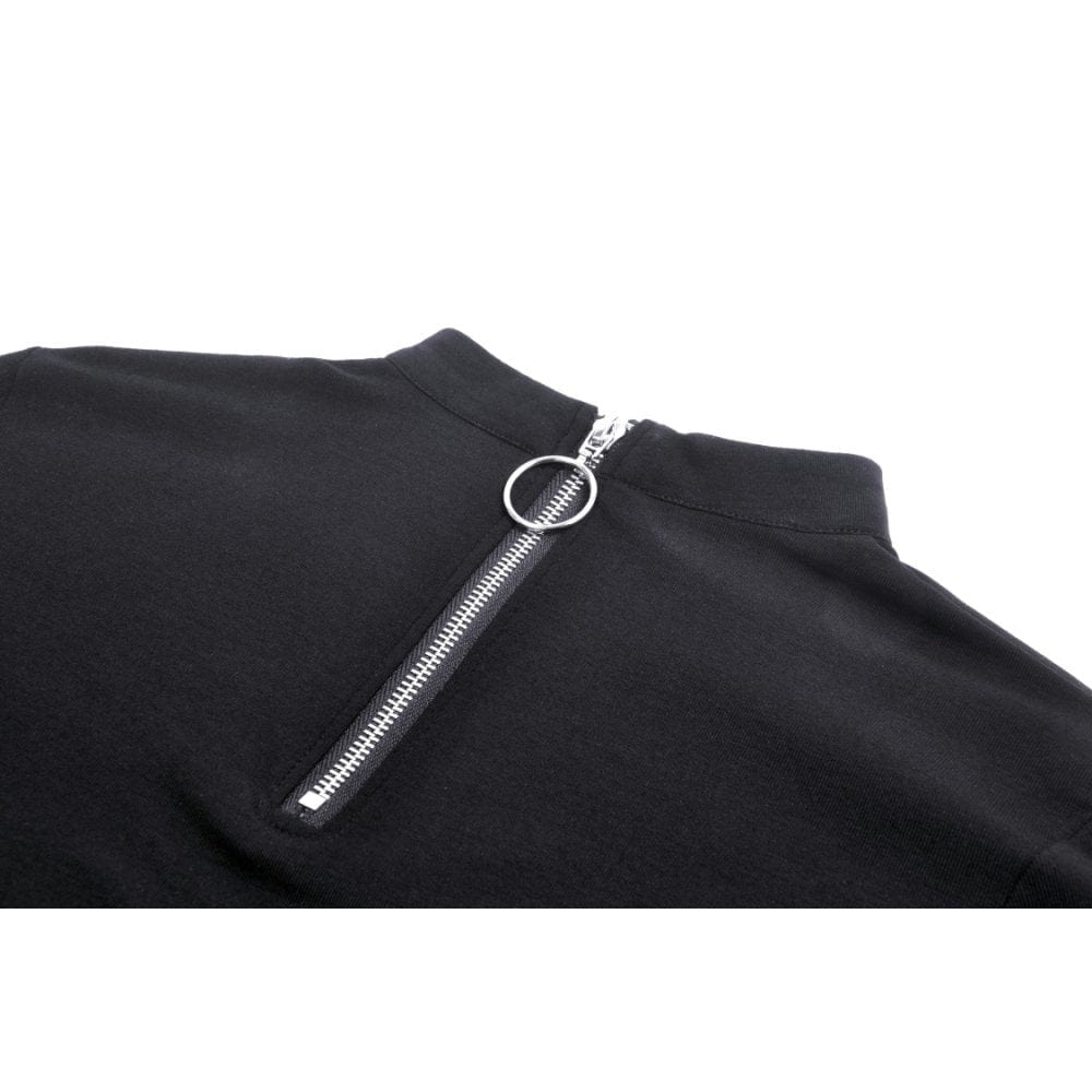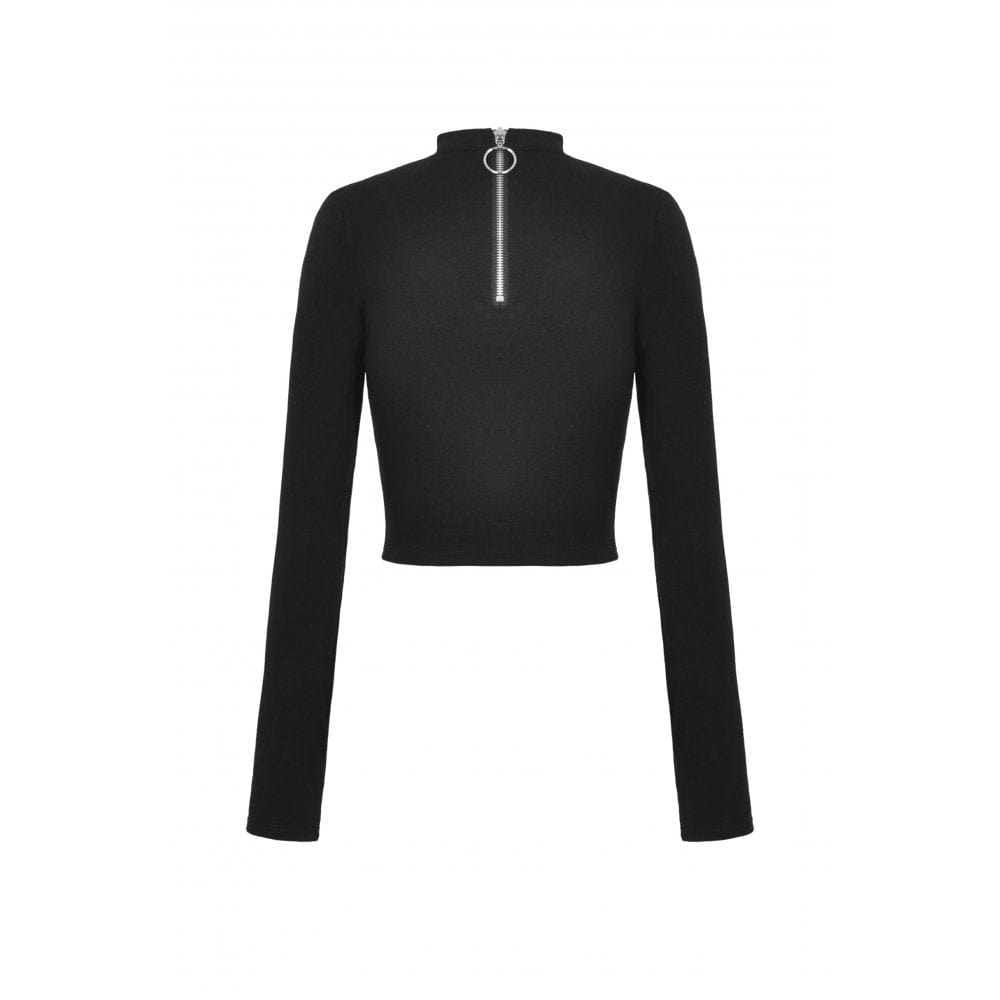 This punk long sleeves crop top has a semicircular hollowed out on the chest. Mesh patchwork eyelets straps and strappy on the front. Zipper on the back for putting it on and off. Slim-fitted silhouette and super elastic fabric.