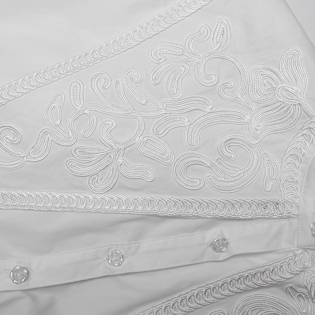 The standout feature of this shirt is its dramatic stand collar, complemented by a delicate shawl detail. The collar, cuffs, and hem are decorated with ruffles that add a touch of gothic Victorian flair. The ruffles continue along the cuffs and hem, creating a layered effect that enhances the shirt's overall luxurious feel.