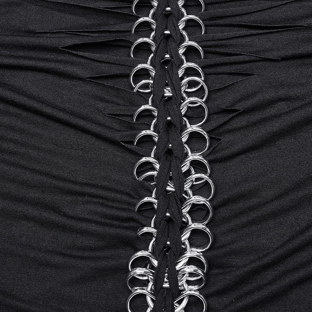 Adding to the shirt’s edgy appeal is the backbone-shaped chain detail, strategically positioned along the spine. This metallic chain, with its gleaming finish, mimics the appearance of a spine, contributing to the shirt's gothic theme. The chain detail is not only a bold design element but also introduces a hot, sexy aspect that complements the overall aesthetic.