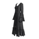 Women's Gothic Floral Embroidered Ruched Lace-up Long Sleeved Dress Black