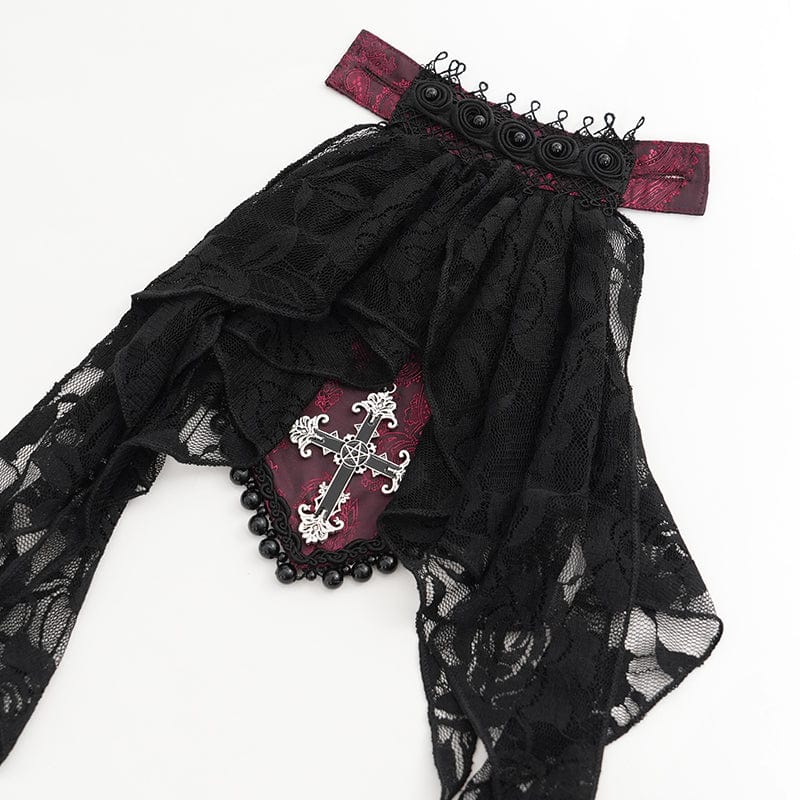 The deep wine-red base, adorned with baroque floral patterns, is accented by a cascade of black lace trim along the placket, lending it the air of a gothic relic. The focal point is the removable lace necktie, complete with beadwork and a jewel cross pendant, creating a noble silhouette that channels gothic vampire and alchemy gothic moods.