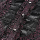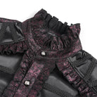 The standout element is the layered interplay of materials. Crushed, subtly patterned fabric creates an ancient parchment effect, while contrasting faux leather panels across the chest and shoulders introduce a dark modern twist. Intricate braided cords frame the chest, bordered by rows of soft ruffles that trace the central placket and shoulder lines with gothic grandeur.