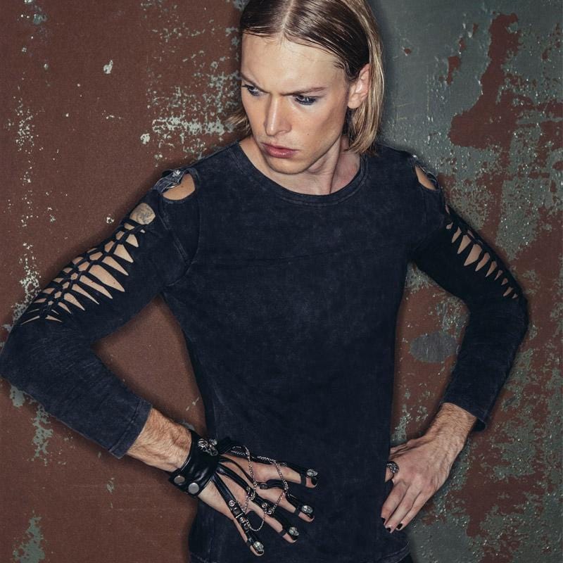 Description:The leather wrist band is more than just a plain wrist band - it has extensions that cover the fingers interconnected with metal chains giving an appearance of a spider's web. Studded with skulls this is the ultimate Goth accessory.