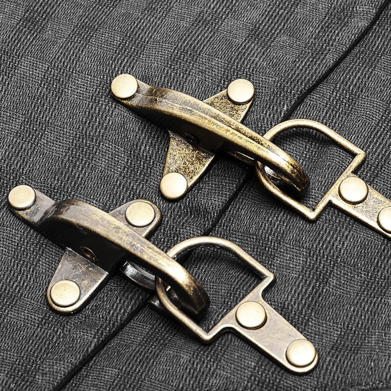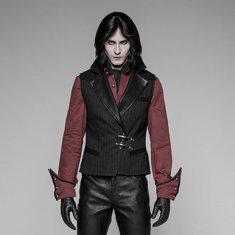Description: Self design fabric has been combined with faux leather to create this fitted vest for men. The steampunk style vest has notch lapels made with leather which have metal flourish corner adding an interesting detail. The front is a cross over with two metal hasps to hold the two front pieces together. The vest has two hand pockets and one chest pocket.