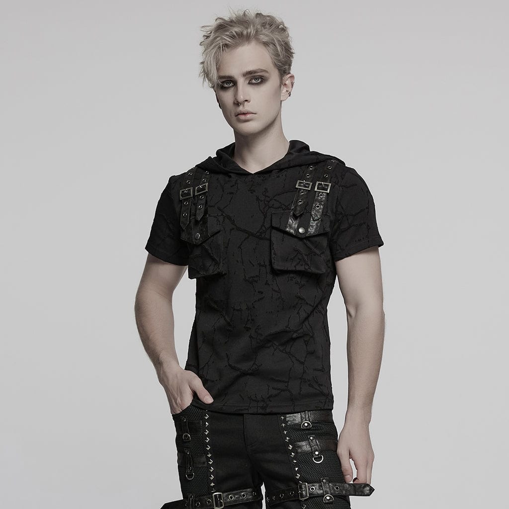 Men's Punk Big-pocket Buckle Strap Hooded T-shirt
