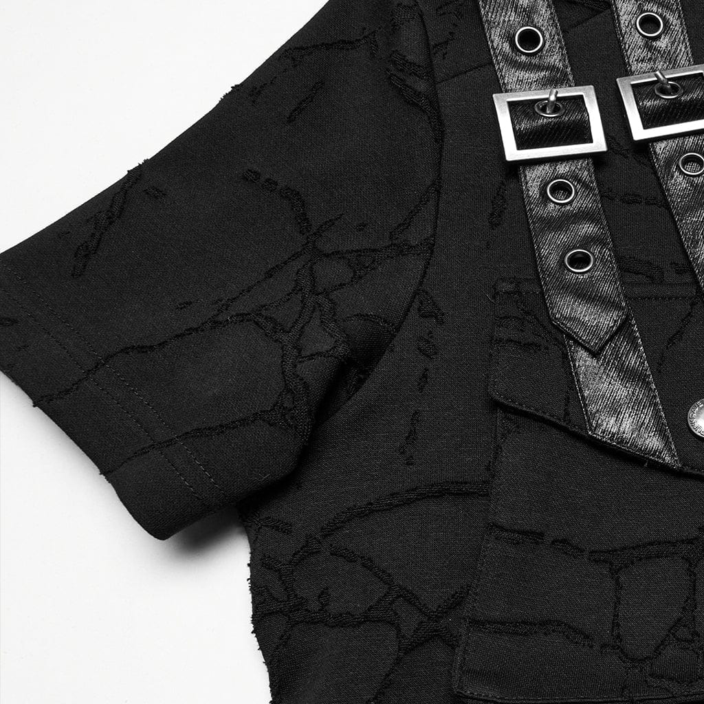 Take your punk wardrobe to the next level with the Men's Punk Big-pocket Buckle Strap Hooded T-shirt. This edgy t-shirt is crafted from elastic knitted fabric featuring a cracked texture, giving it a distinctive distressed look that is both stylish and comfortable. The textured fabric adds depth and character, making this piece stand out in any alternative wardrobe.