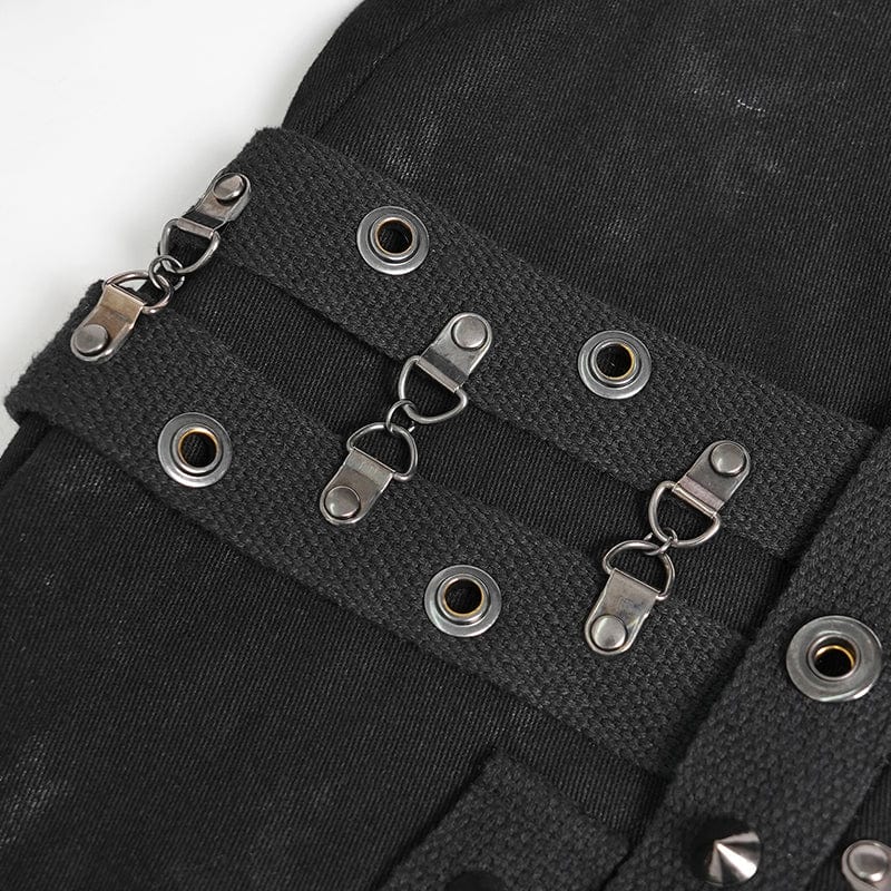 Metal buckles, rings, and straps on the pants are combined with a criss-cross lace-up design, creating a strong rebellious punk vibe for an eye-catching look.