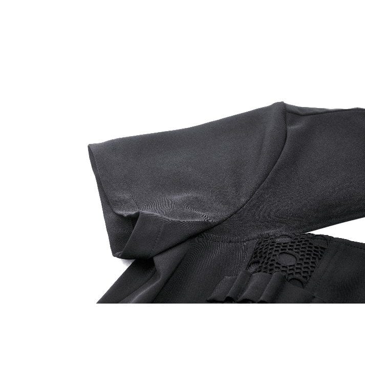 The front of the dress is embellished with mesh patchwork, creating a captivating contrast against the solid fabric. This mesh patchwork adds texture and visual interest, enhancing the dress's gothic allure.