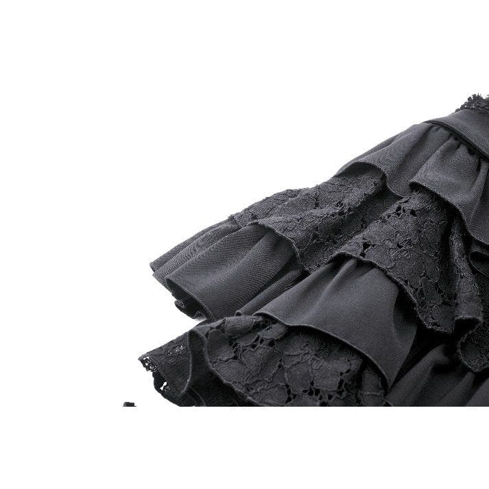 The skirt's hem is adorned with ruffled layers, adding volume and movement to the garment. The ruffled layers create a dramatic and feminine look, perfect for Gothic-inspired outfits or special occasions.