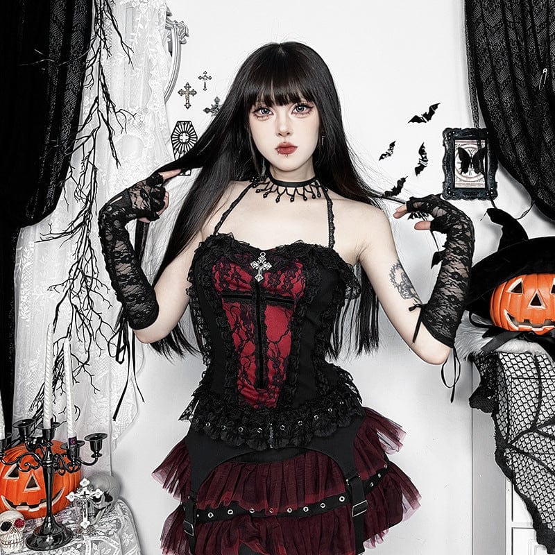 Women's Gothic Mesh Buckle-up Short Skirt Black Red