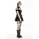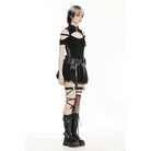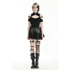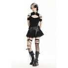 Eyelet straps on the waist serve as decorative accents, enhancing the punk vibe of the skirt. These straps add a touch of hardware-inspired style while contributing to the overall edgy look.