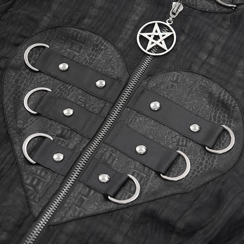 Crafted from semi-sheer striped fabric, the shirt delivers a delicate yet bold look, allowing for a glimpse of underlying layers while maintaining an air of mystery. The stand collar with a pentagram charm adds a powerful gothic symbol, enhancing the occult-inspired aesthetic. The puff sleeves lend a touch of historical elegance, balancing the edgy elements with a refined silhouette.