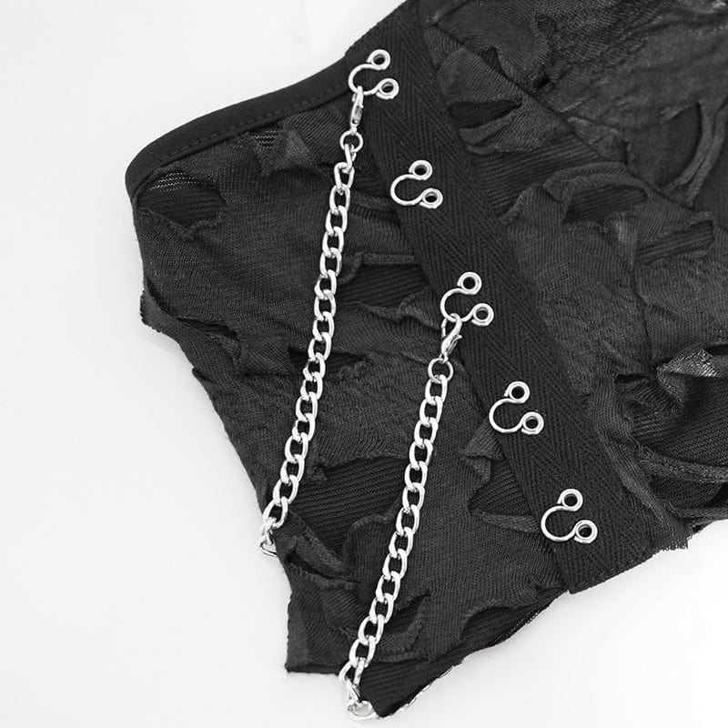 A front zipper closure not only enhances the shirt’s utilitarian appeal but also allows for an adjustable fit, adding versatility to styling options. The attached metal chains and ring details contribute to its hardcore aesthetic, making it a must-have for alternative fashion lovers. The combination of strap accents, studded choker-style neckline, and arm details brings an industrial edge, perfect for those who love to incorporate elements of punk, goth, and cyber aesthetics into their wardrobe.